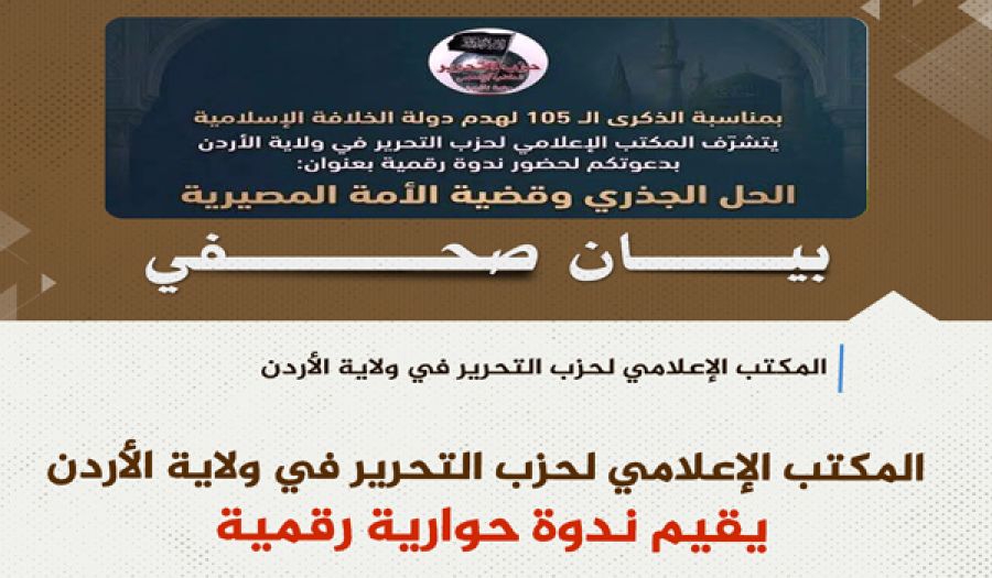 نظم المكتب الإعلامي لحزب التحرير في ولاية الأردن ندوة رقمية بمناسبة الذكرى الـ105 لهدم دولة الخلافة بعنوان: "الحل الجذري وقضية الأمة المصيرية".